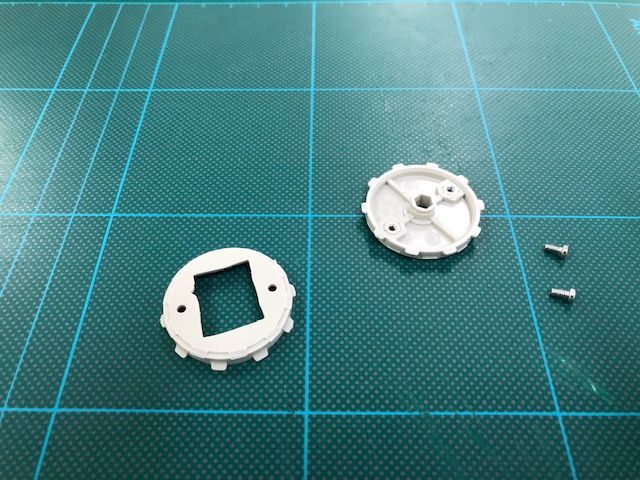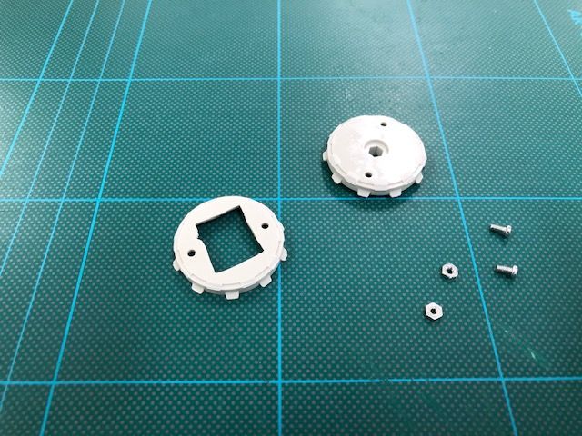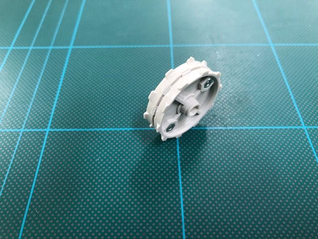 穴をあけたホイール2個の、表側の周りの突起をすべて切ります。
