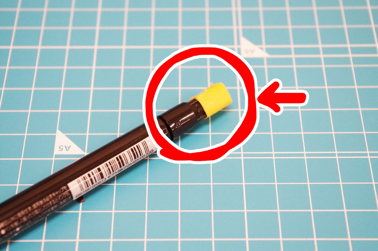 ペンによるのですが、フタが細すぎる場合はこのようにテープでペンを太らせます。