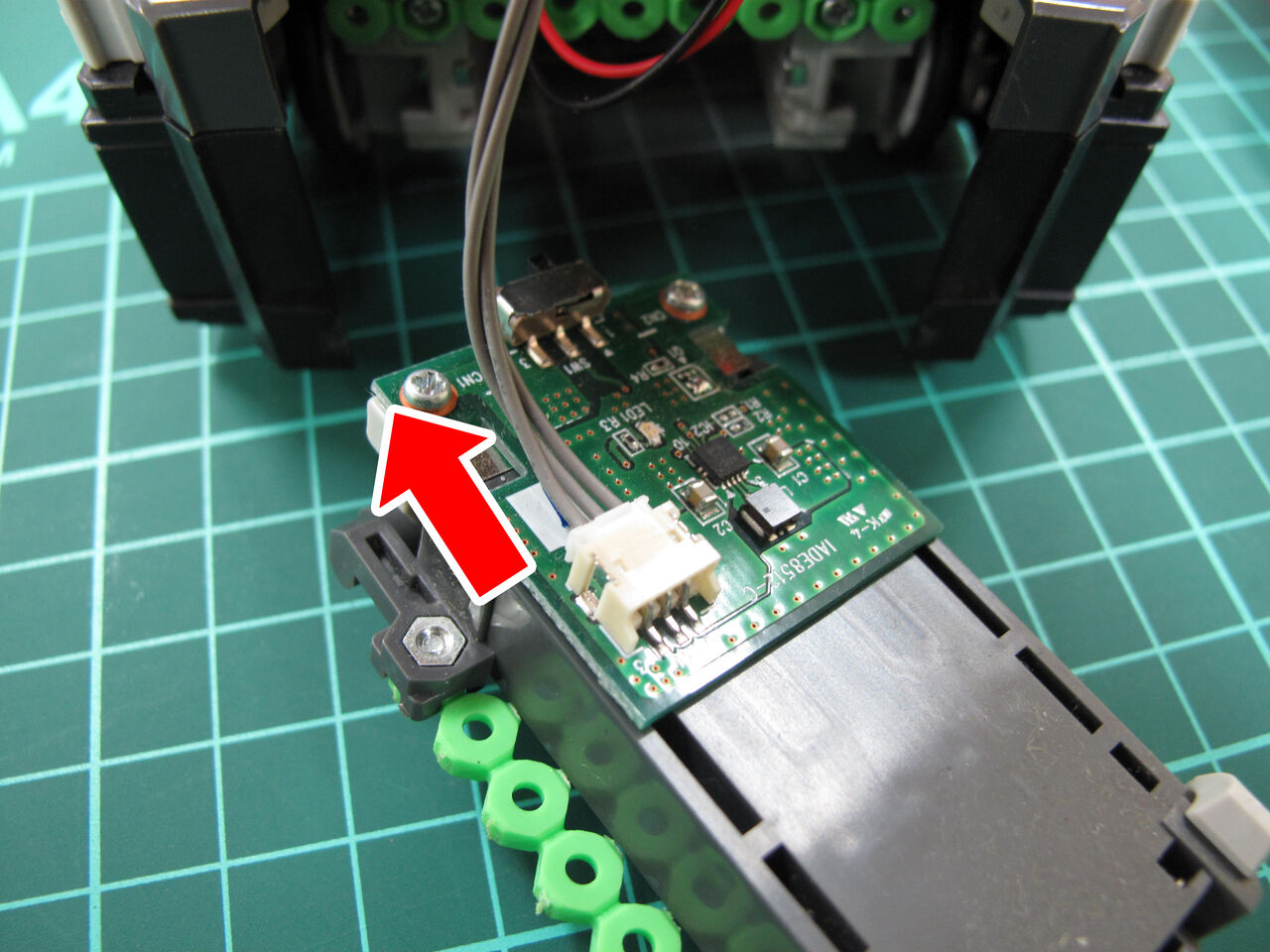 『昇圧基板』を取り付けることにより、ミニロボのロボット基板へ送られる電気の電圧が3.2Vに