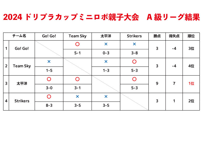 ※Go!Go!とTeam Skyは勝点と得失点差が同じだったため直接対決で勝っているGo!Go!を3位とさせていただきます