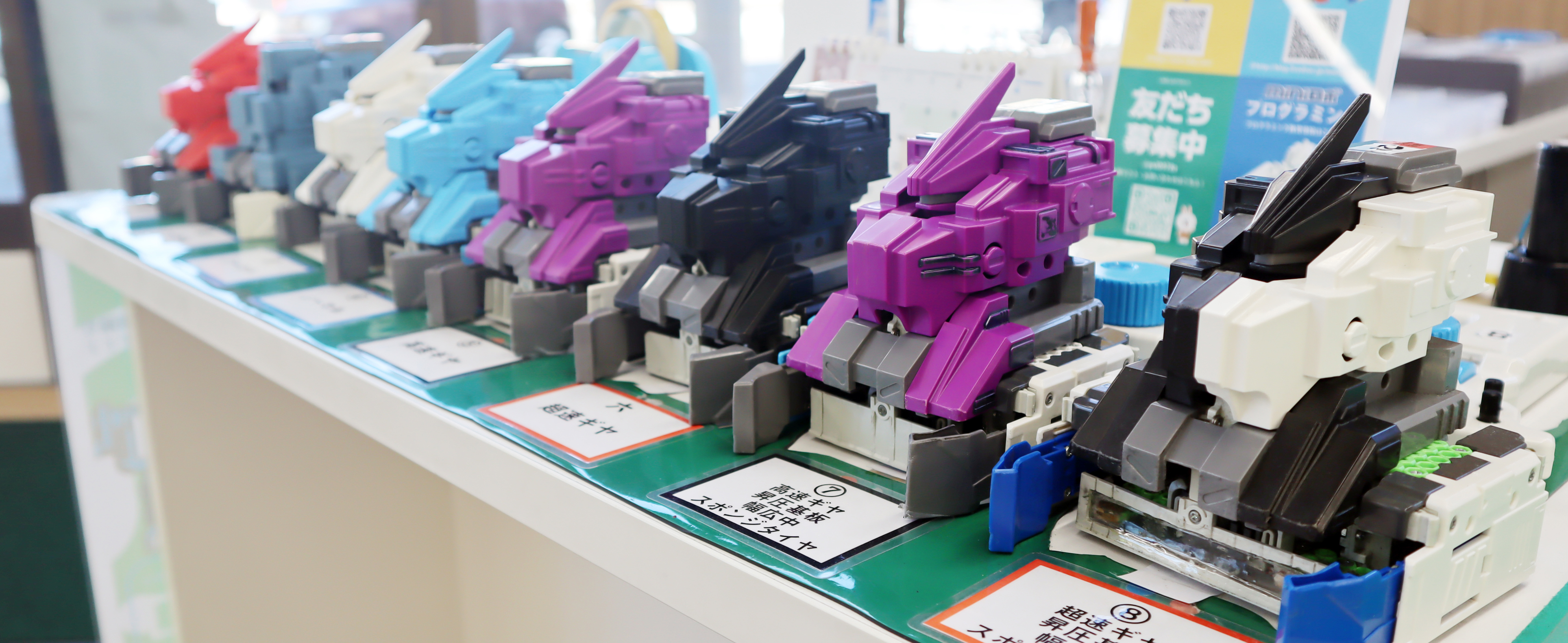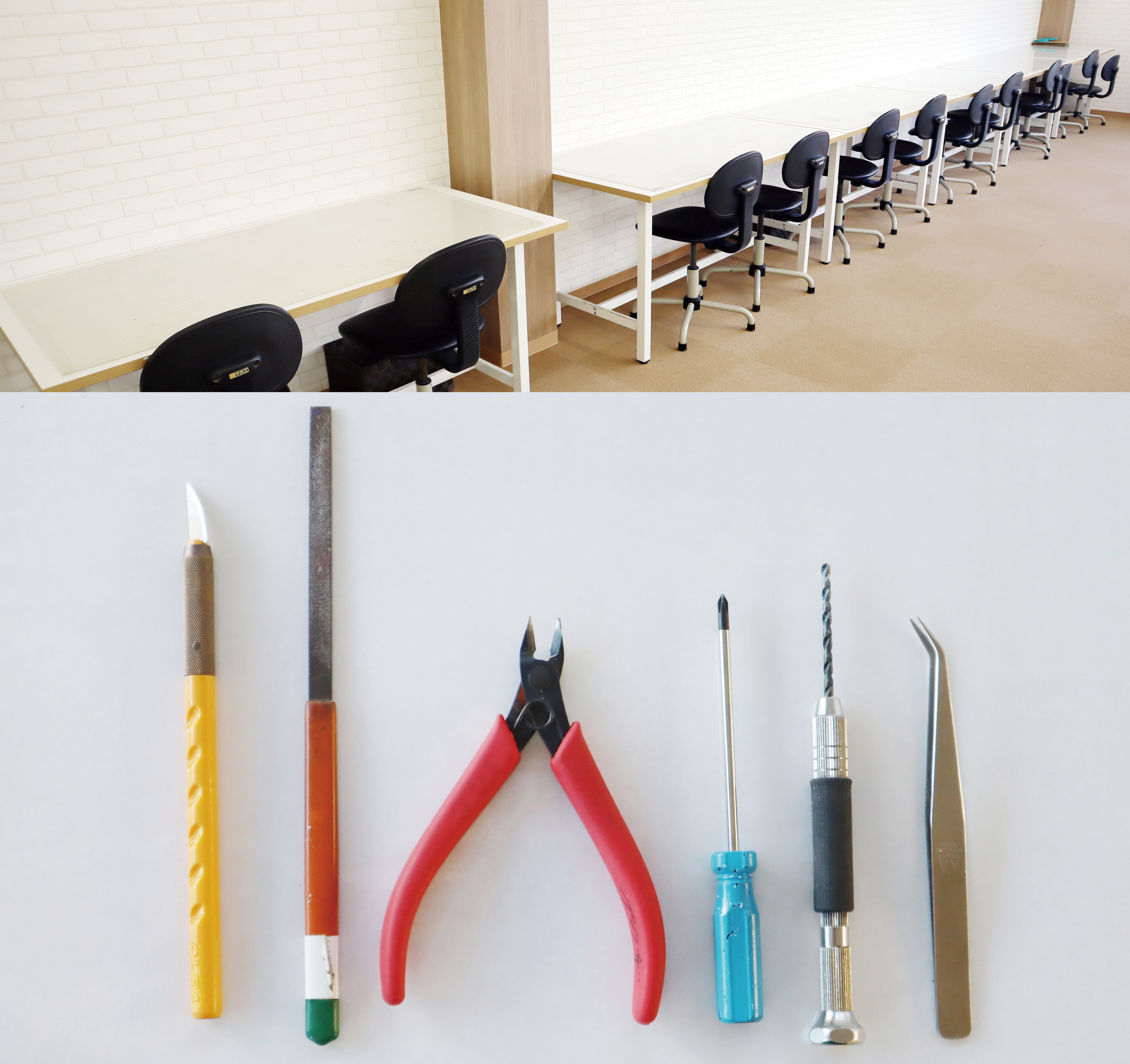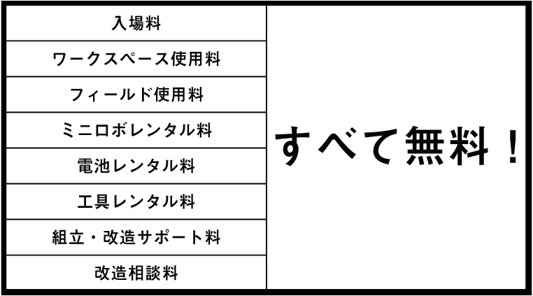 自分のミニロボを組立や改造するためのスペースの提供と工具の貸し出しがあります。組立・改造に不安がある場合はスタッフがサポートします。また、改造に関してのご相談にも対応します。