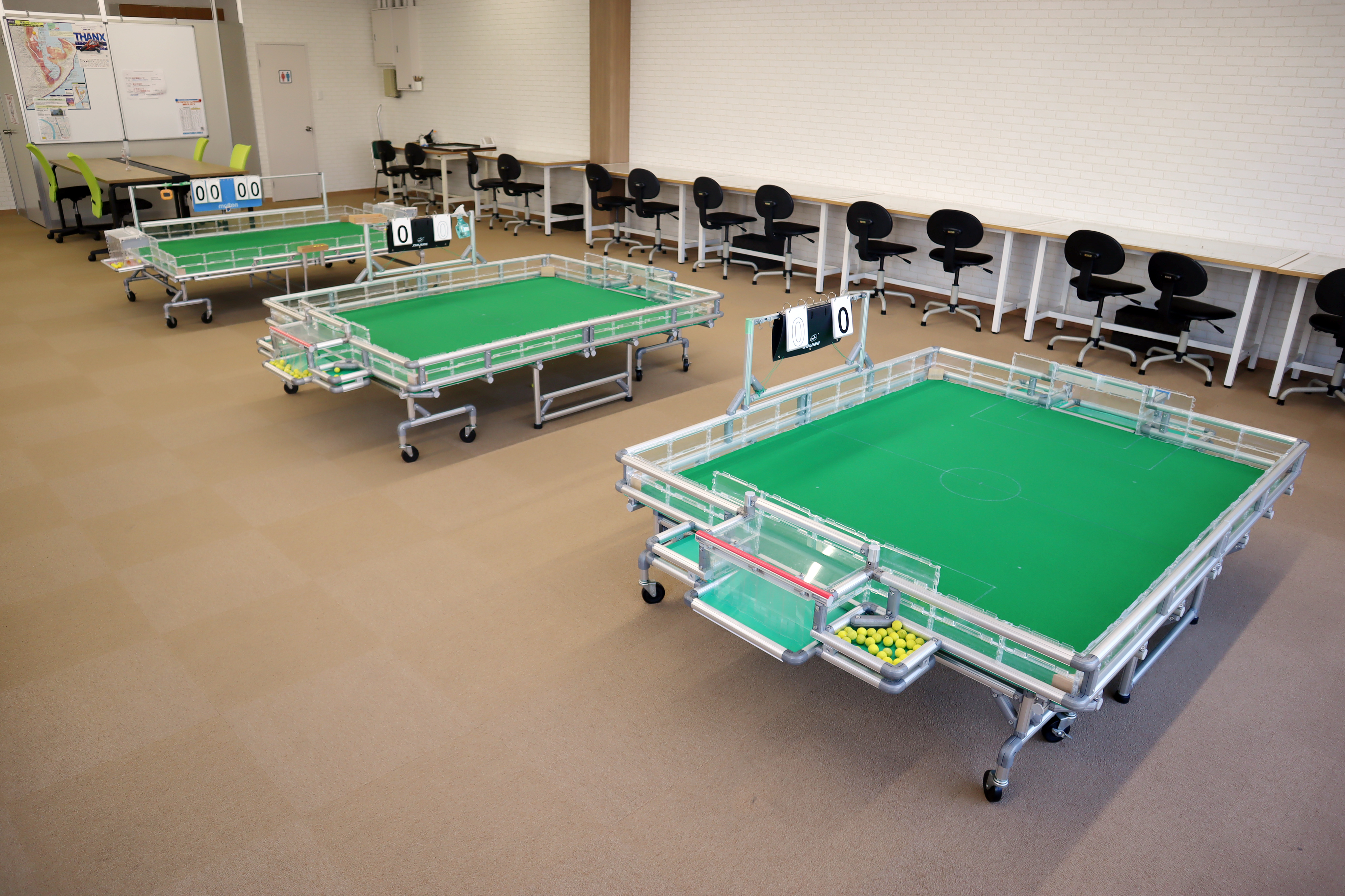 遊びに来ている他のミニロボユーザーやスタッフとチームを組んでサッカーの試合ができます。ミニロボに使う電池のレンタルサービスもあるため、心おきなく試合を楽しめます。