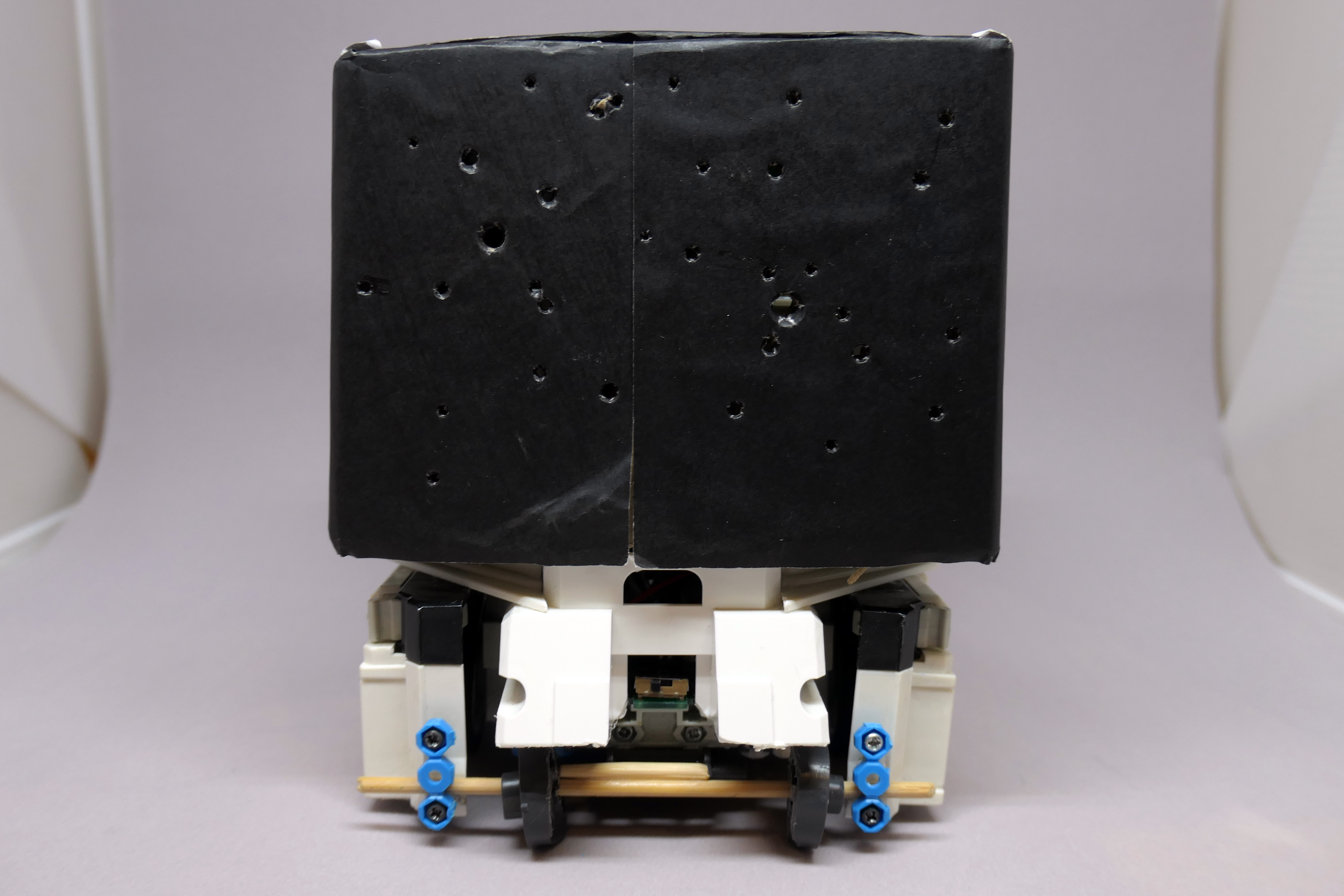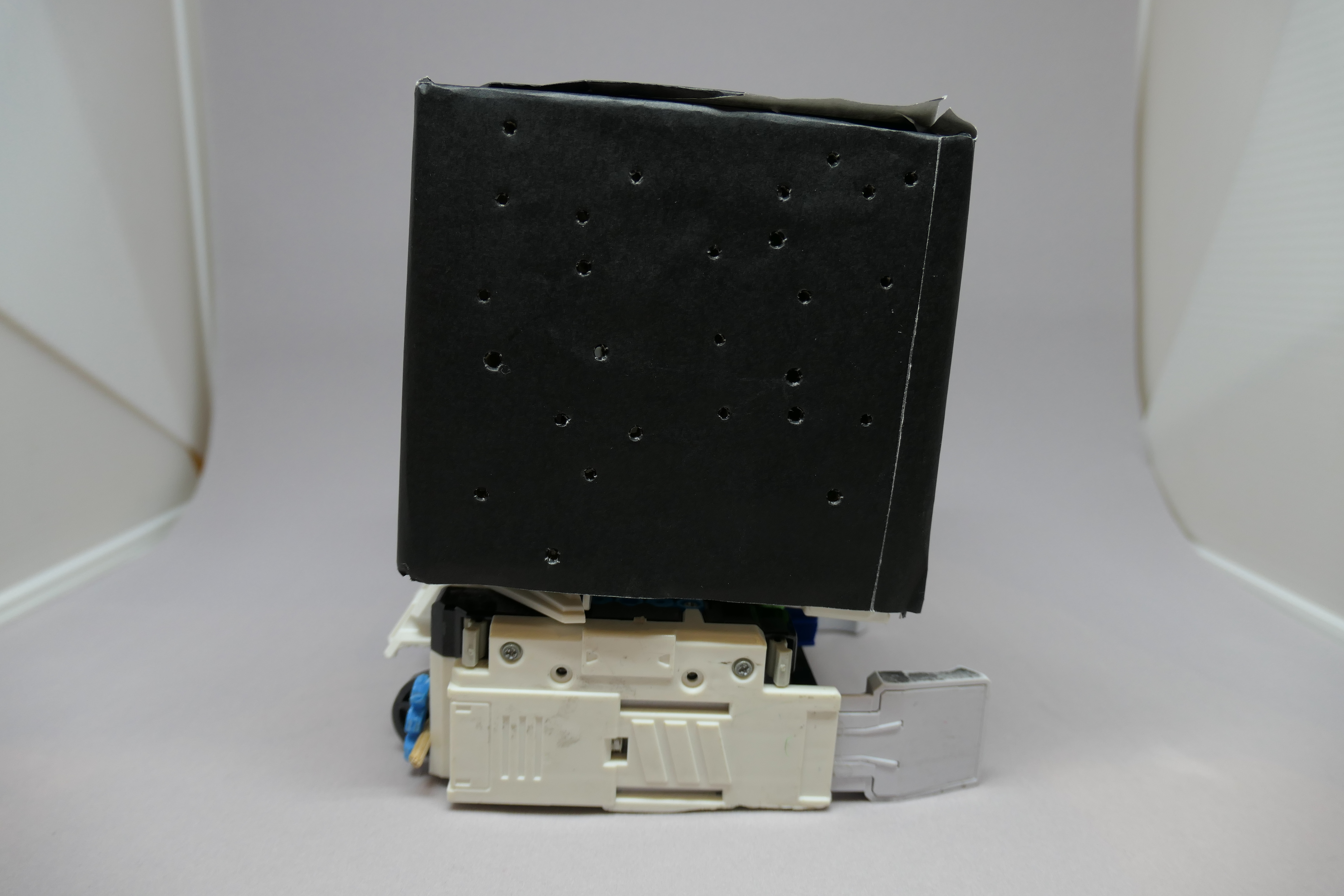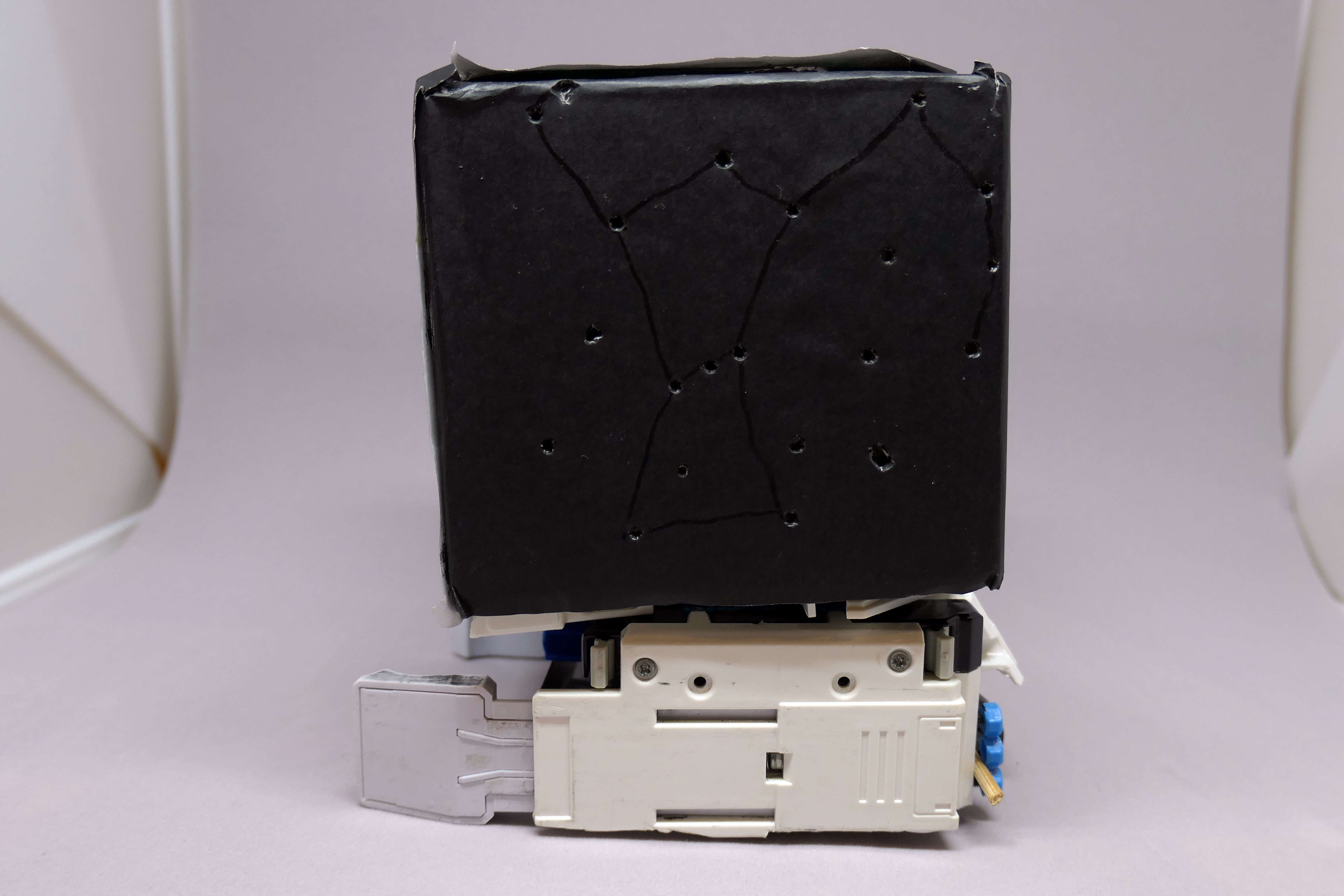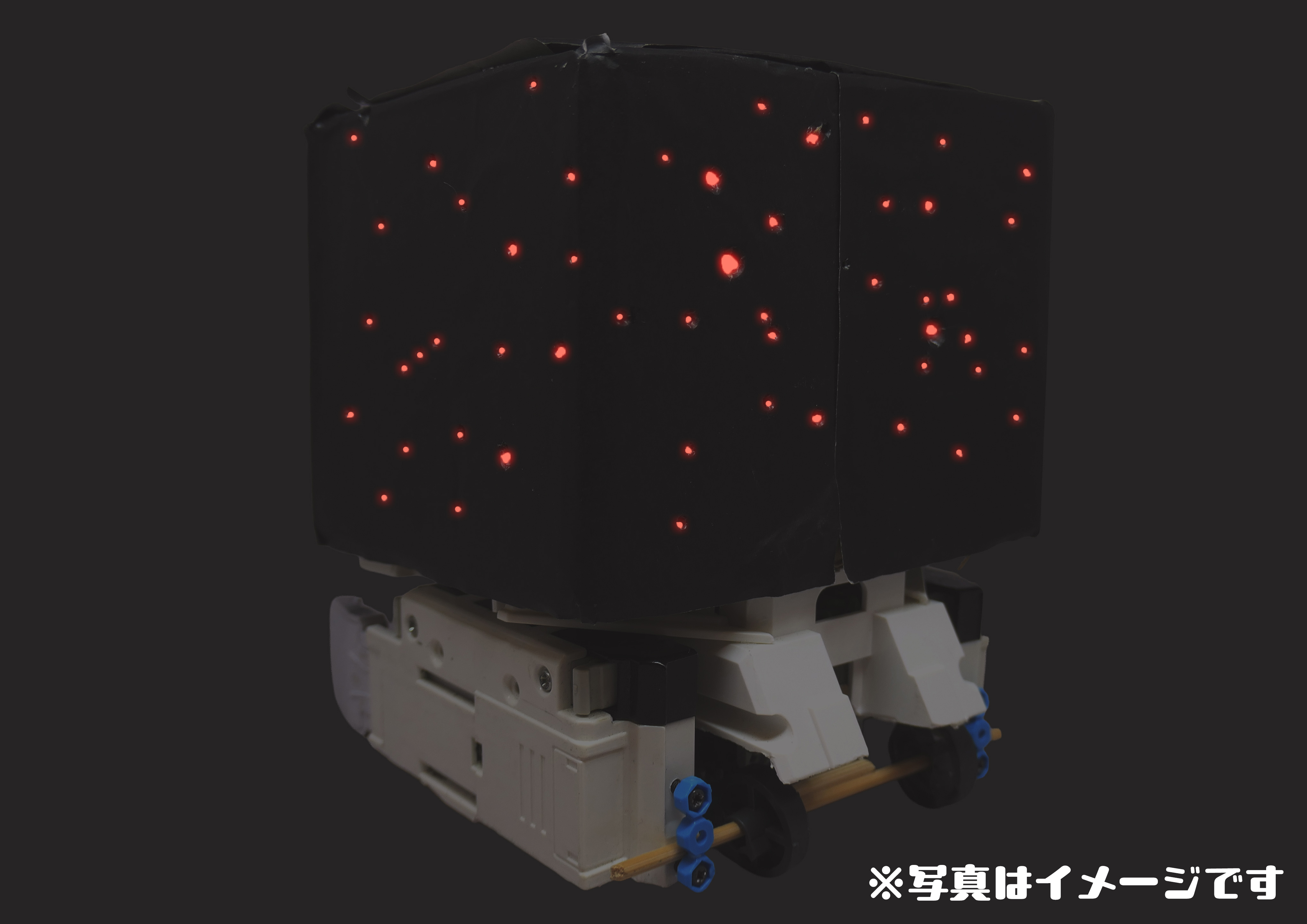 箱の中に赤色の明かりが入っています。暗いところで光らせると、上のように穴から光が漏れて星座が見えるようになっています。