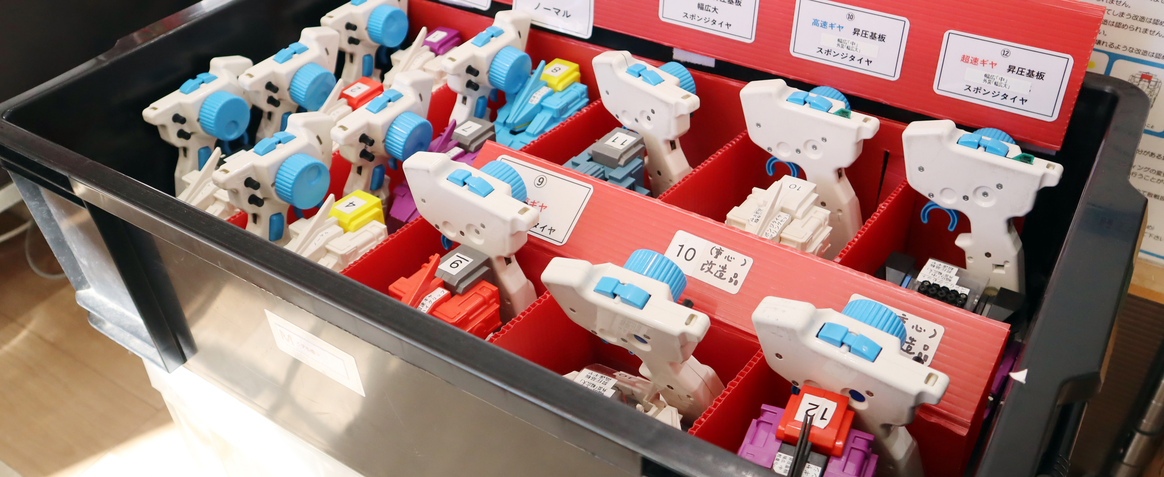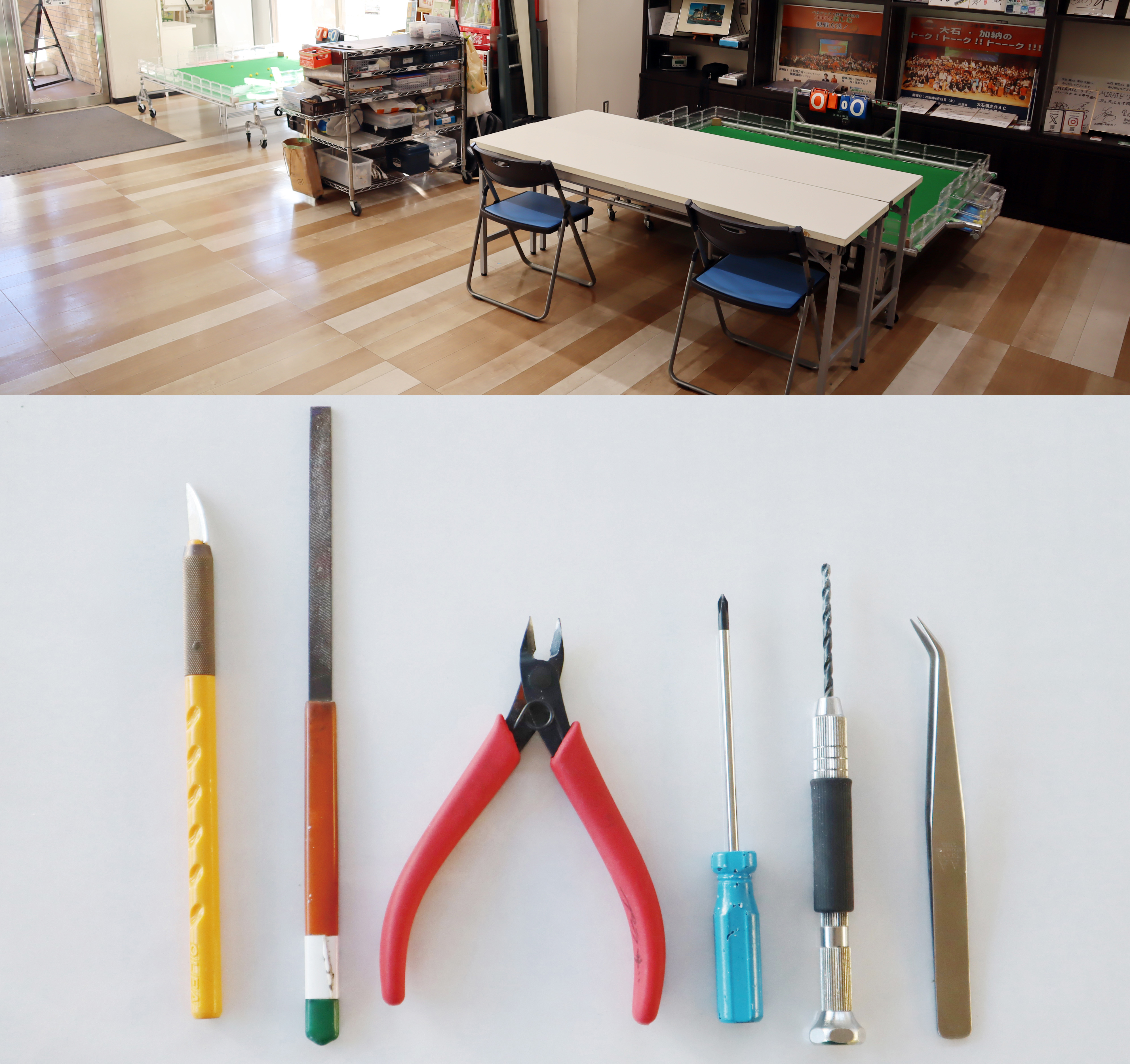 自分のミニロボを組立や改造するためのスペースの提供と工具の貸し出しがあります。組立・改造に不安がある場合はスタッフがサポートします。また、改造に関してのご相談にも対応します。