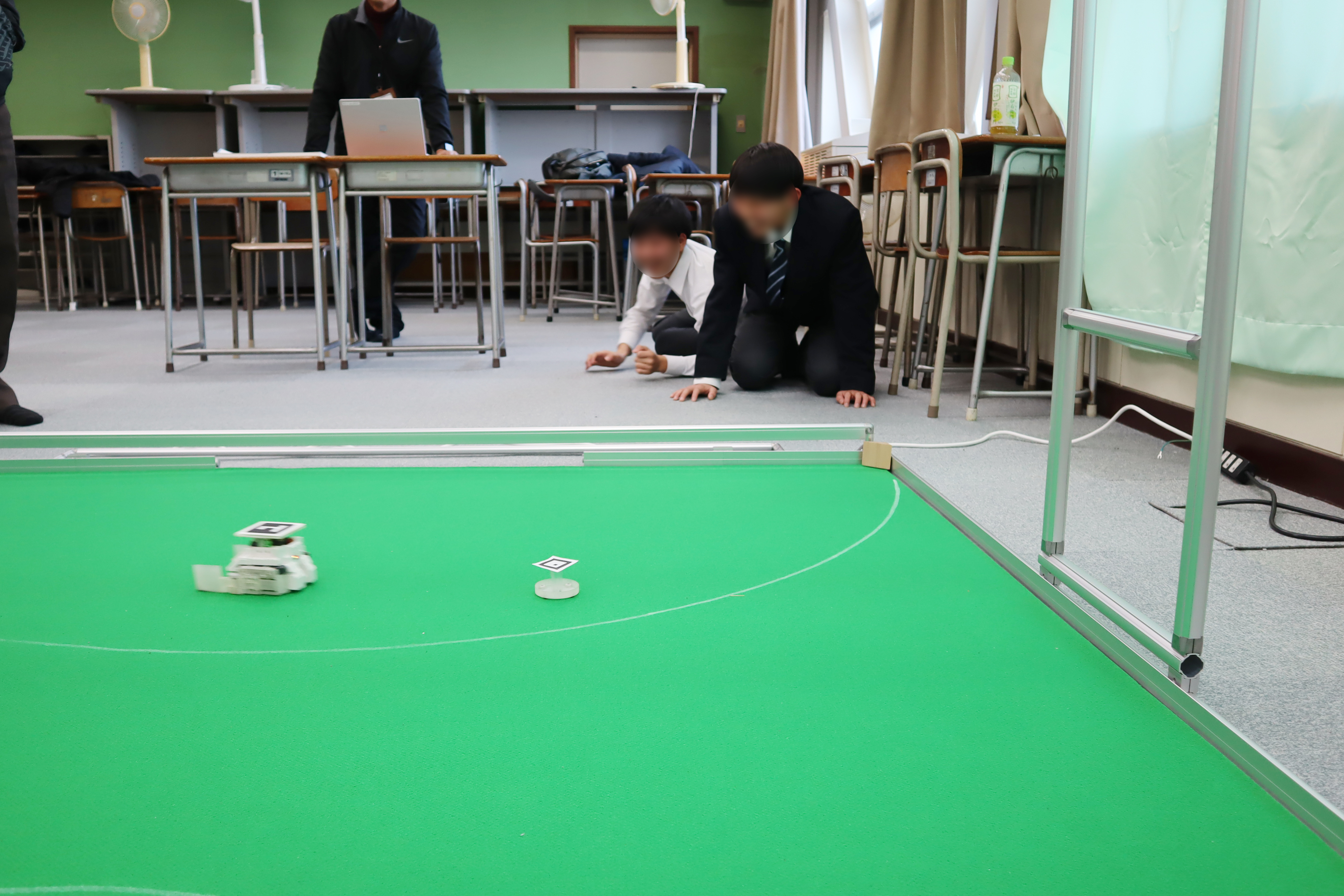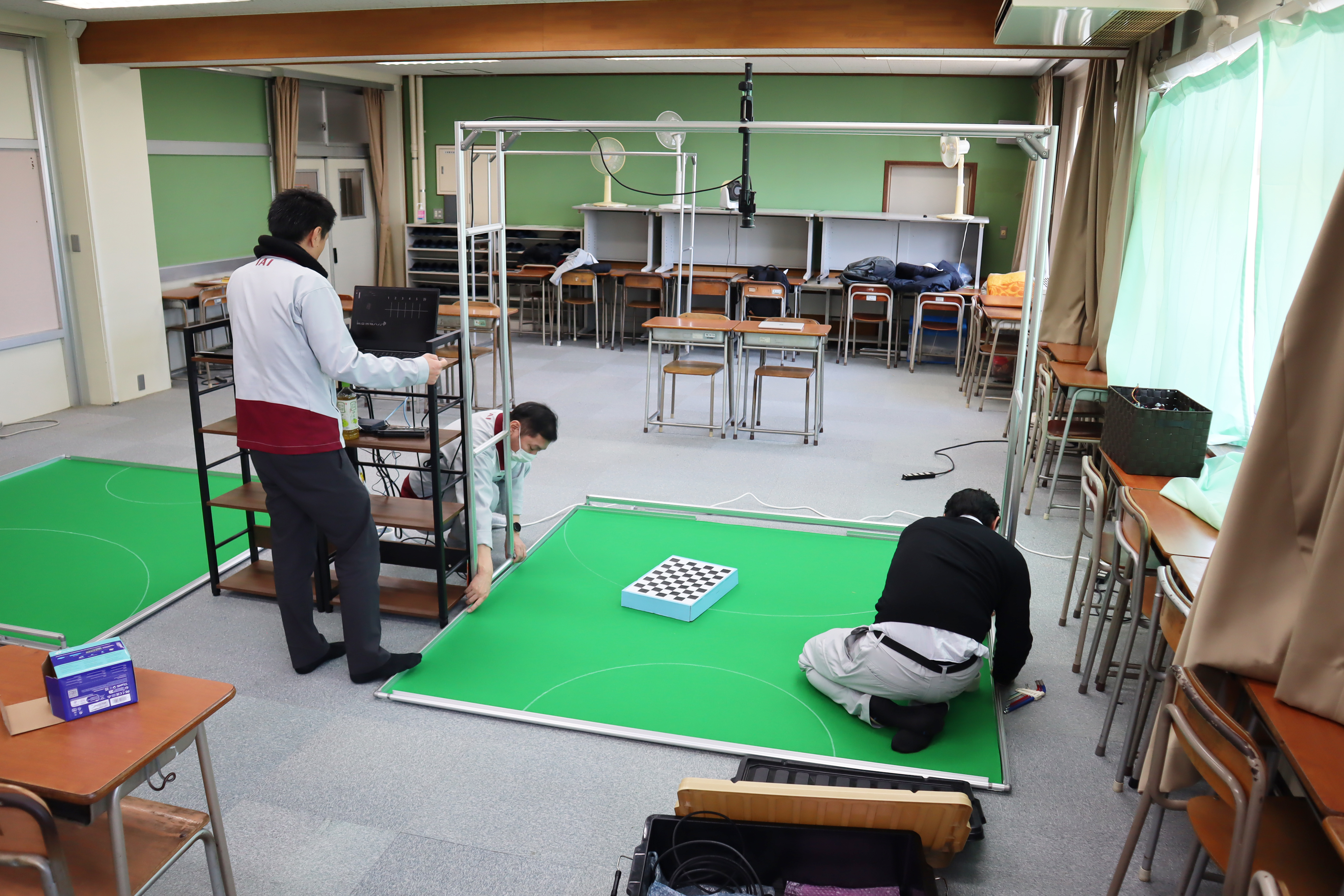 VS専用フィールドを設置中です。フィールド上のカメラから位置情報を入手するのでカメラ位置を適切な場所に調整する必要があります。とても慎重な作業です。